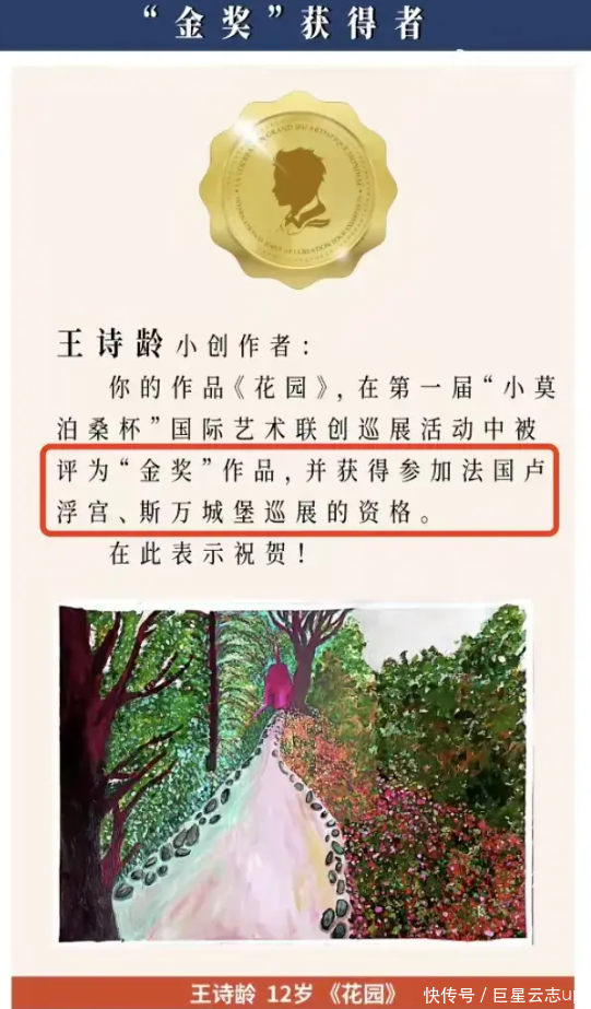 王诗龄从小就采纳爷爷的教育,大画家的家里,也有了一个小画家,从小王诗龄就师法爷爷的样式,再加上有了姆妈的物资付出,让王诗龄从小就赢在了起跑线。王诗龄也莫得让家里东说念主失望,她从小就展现了惊东说念主的画作资质,何况屡次在国表里受过大奖,昔日不能限量!