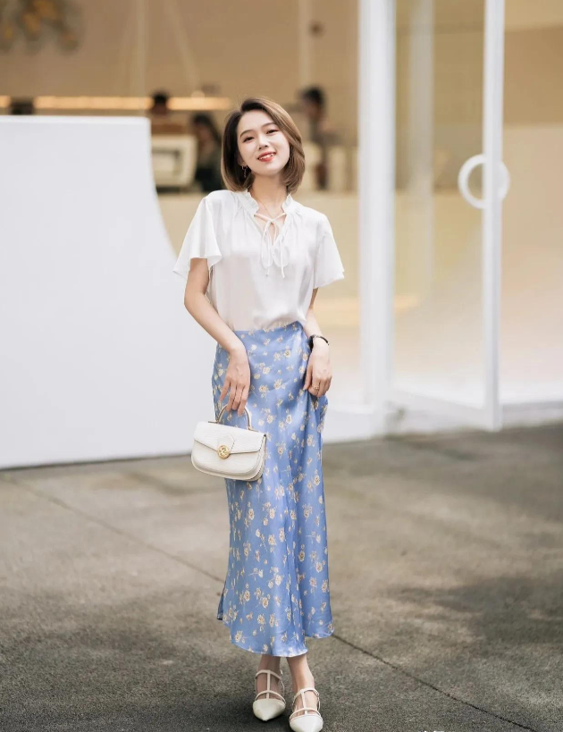就像底下这套穿搭,白色的小众衬衫上衣搭配上印花的半身裙,浅蓝色的印花半身裙就能让统统这个词造型愈加有活力。