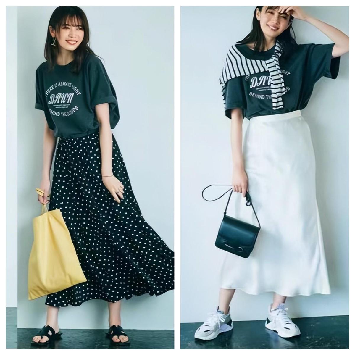 一、短袖T恤搭配半身裙,遮肉显瘦