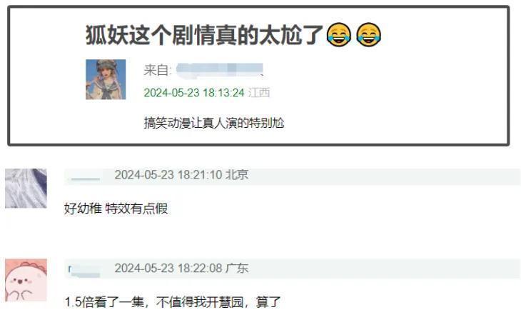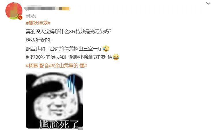 从郭晓婷到胡连馨等一众女配,演技相同样式化,涂山雅雅、涂山容容在原著中性格互异的变装,到了剧里合资横目撅嘴,性格只可靠台词体现(还皆是配音)。